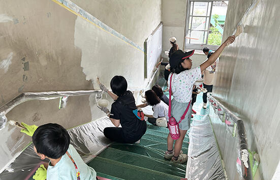 今回、ボランティアを行ったのは、明治10年に創立し、2027年に創立150周年を迎える下坂部小学校。現校舎の竣工も昭和12年と歴史と趣に溢れた校舎。2年後に建て替えが決まっているが「子供たちに楽しい経験を提供したい」(碇裕樹校長)とボランティアを受け入れ。当日は、校舎中央の1階から3階までの階段、壁面を塗装した。