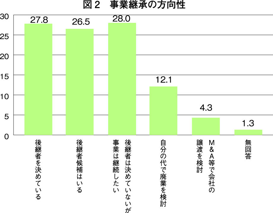 事業継承については、80%を超える組合社店で事業継承を計画している一方、12%超で「自分の代で廃業を検討」している実態が浮き彫りとなった(図2)。特に、1号組合員(従業員数1~10人)で廃業を検討している割合が高い。