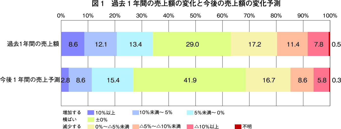 過去1年間の売上額は「横ばい」が29.0%で最多。今後1年間の売上予測では、社店の約73%が「横ばい」もしくは「減少」と予測(図1)。