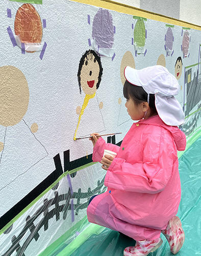 笑って糸のようになった目、お茶目なウインク、ピンクのほっぺ、色とりどりのスモック。どの似顔絵からも子供たちのワクワクした気持ちが伝わってくる。「お絵描きといっても画用紙に描くくらいで、こんなに大きな壁に描くのは子供たちも初めて。貴重な経験をさせてもらっています」と先生たちの声も弾む。6人ずつ3班に分かれてのお絵描き作業は1時間半ほどで終了。18人の小さな画伯の似顔絵が完成した。
