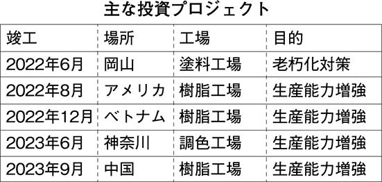 主な案件では、まず米国のテネシー州チャタヌーガの新樹脂工場。今後の北米自動車塗料生産の戦略拠点となる。続いてベトナムのハノイに新樹脂工場。アジアの中でも特に成長率が高い国のため、塗料原料である樹脂工場を建設する。塗料工場は既に数年前に新工場が稼働しており、これによりアジア全体のサプライチェーンを強固にする。中国(天津濱海)でも同様に樹脂工場を新設する。