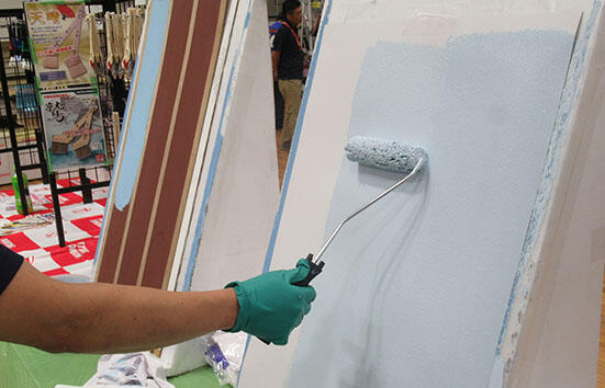 大塚刷毛はローラーキャンペーンを8月~10月の期間で実施しており、会場でも「スクリュー」「Sky」「Micro Grande」など各種ローラーをデモをしながらPRした。実際にローラーを体験でき、ユーザーは使いやすさなどを確かめていた。