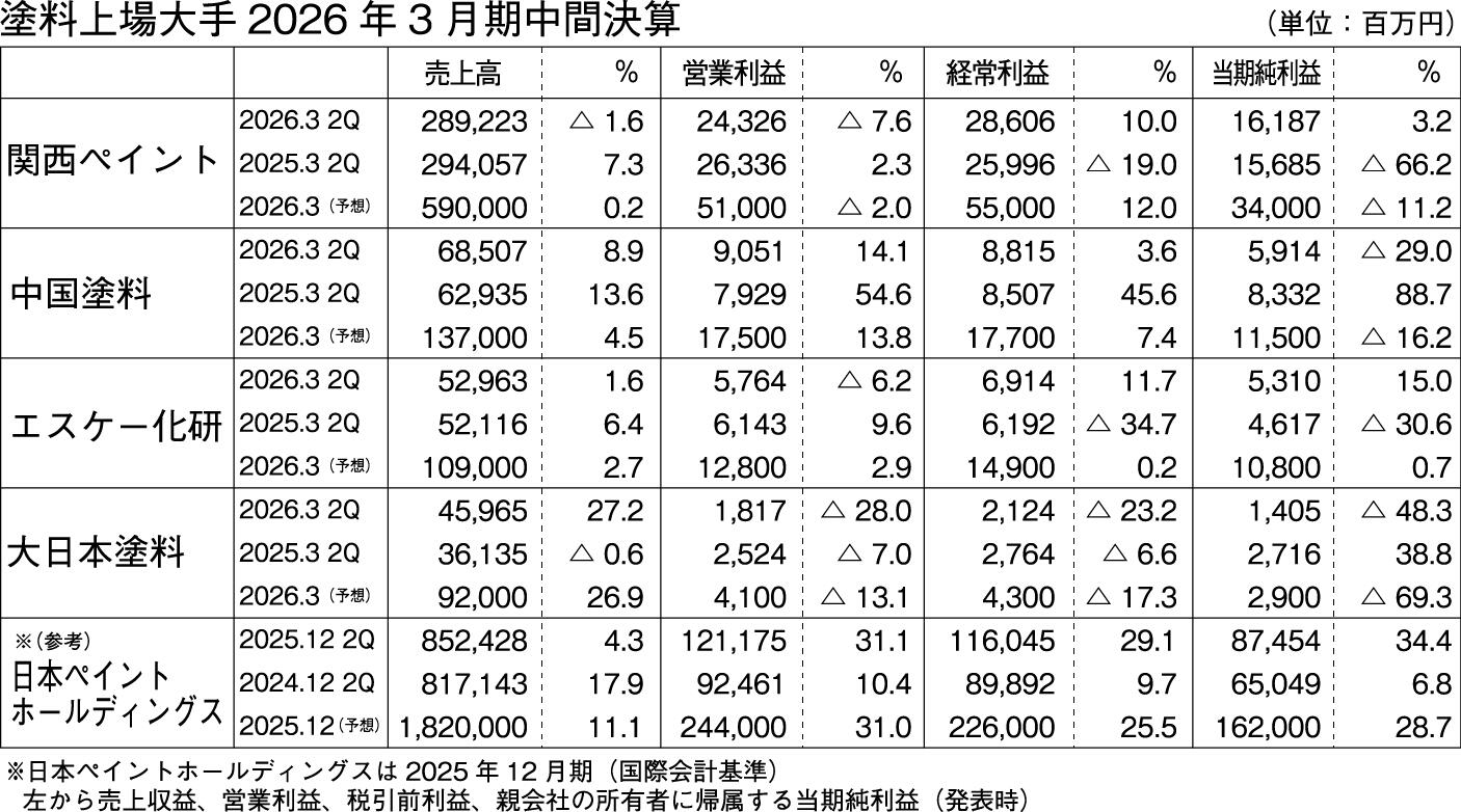 大手上場塗料メーカー4社を合わせた2026年3月期の中間業績は、総売上高4,566億5,800万円(2.6%増)、総営業利益409億5,800万円(4.6%減)となった。増収増益(営業利益)を計上したのは、中国塗料の1社。エスケー化研、神東塗料を連結子会社化した大日本塗料の2社は増収減益。関西ペイントは減収減益となった。価格是正を推進する一方、需要全体としては国内外とも需要に力強さが欠ける。地政学的リスクやアメリカの通商政策、円安、人件費・エネルギーコストの高騰などの課題が山積する中、各社の収益改善策に関心が集まる。