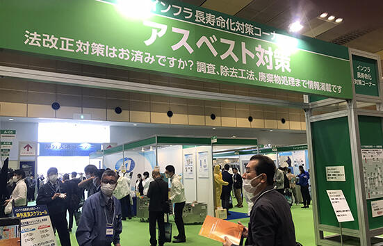 また今回、新たに設けられたエリアが、「インフラ長寿命化対策コーナー」だ。アスベスト、鉛・PCB対策、鋼構造物などインフラの長寿命化といった喫緊の社会課題に対して資機材や新工法の提案を充実させたもの。「橋梁の改修に伴う鉛・PCB対策、建物改修でのアスベスト塗膜除去などハードな現場が確実に増えている。難しい仕事である反面、大きなビジネスチャンスでもあり、それらの仕事に携わっているお客様のお役に立ちたい」(担当者)と同コーナーを設置した理由を説明。