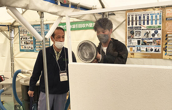 屋外コーナーでは、超高圧外壁ハツリシステムや湿式ミストエアーサンダー、汚水吸引回収外壁洗浄システムなど実機によるデモを実施。ここでデモ機を試した来場者は、「ハツリのパワー、吸引力や音など実際の使用感がよく分かり、とても参考になった」と仕事のヒントになった様子。"見て、触れて、試せる"マルテー祭の醍醐味を味わっていた。
