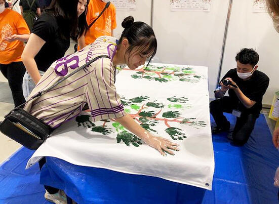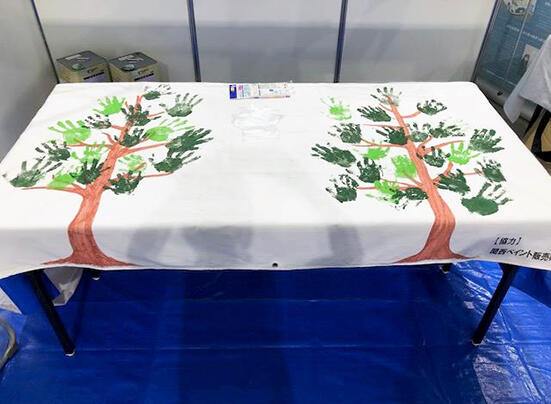 横断幕に描いた木の幹に来場者が塗料を手に塗り付け、手形をスタンプしていくというもの。スタンプされた手形を葉っぱに見立て、緑鮮やかな木に仕上げた。使用塗料は「ダイナミックTOP」(15kg×2缶)。