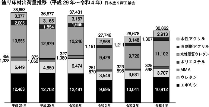 日本塗り床工業会の統計によると、新型コロナの感染拡大が始まった令和2年は前年比25.9%減の2万7,746トンと落ち込んだものの、令和3年は前年比3.4%増の2万8,678トン、令和4年は7.6%増の3万862トンと2年連続の伸長となった。半導体工場や物流倉庫の新設需要も下支えした他、令和5年も各メーカーとも数量を伸ばしており、回復基調を顕著にしている。
