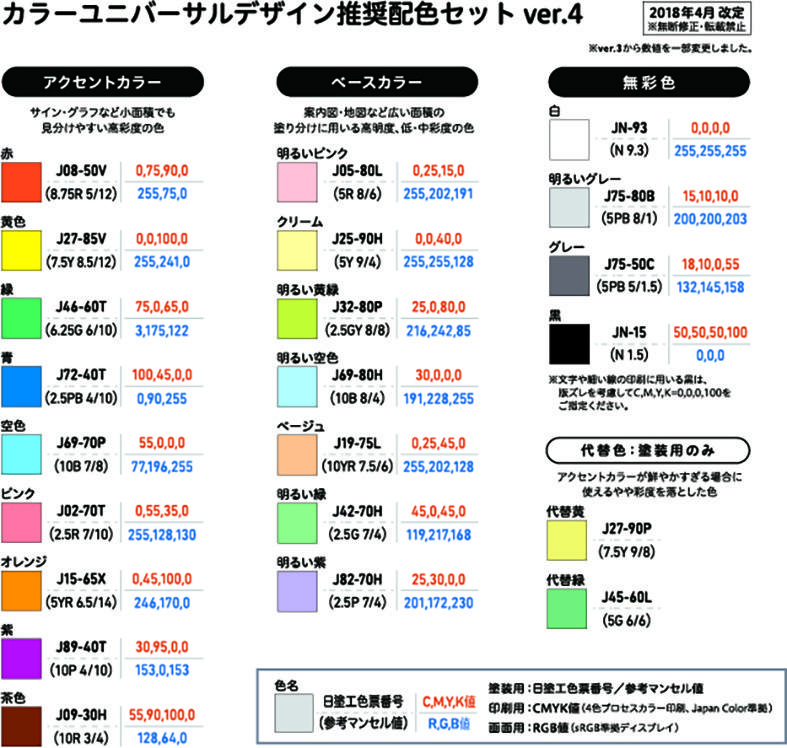その結果、①さまざまな色覚の人に見分けやすく②色名を使ってコミュニケーションでき③塗装・印刷・画面の異なる媒体で再現可能な色として調整、選定された推奨配色セットとして確立。それぞれの色がデザインの現場で指定できるよう塗装・印刷・画面表示の用途別に色彩値も付された。