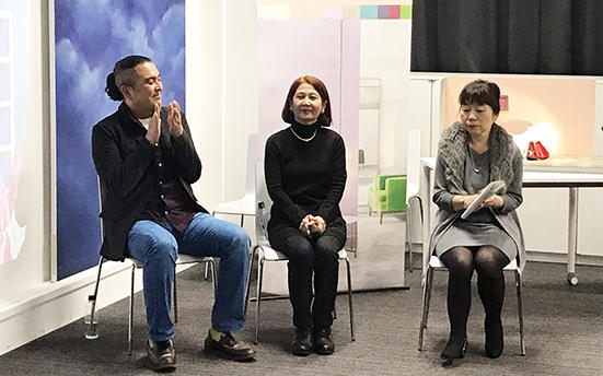 今回は、「KIP's」の中からインテリアコーディネーターの西堀トシコさん(写真中央)と岩藤奈生子さん(同右)、そしてペインターを代表して坪井邦夫氏(同左)が登壇、インテリアペイント施工の具体例を示しながらそれを"魅力化"する勘所について話した。