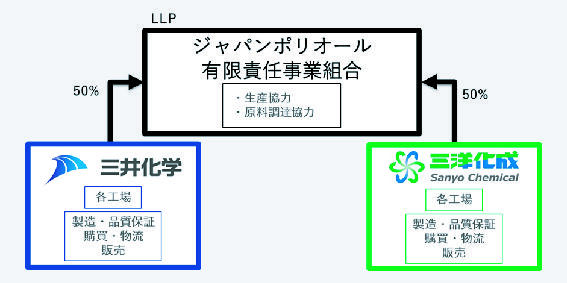 来月以降にはスワップや製造受委託などの両社製造拠点の相互活用による生産合理化や酸化プロピレンなど主な原材料の共同交渉による調達合理化を行っていく予定。LLPを設立後も生産、販売などは各社で継続運用するとしている。