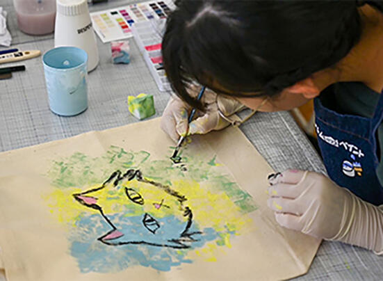 その調色した色を使って最後にトートバッグを制作。刷毛や筆、手形などで自由に描かれ、芸術祭にふさわしい独創性の高い作品が生み出されていた。