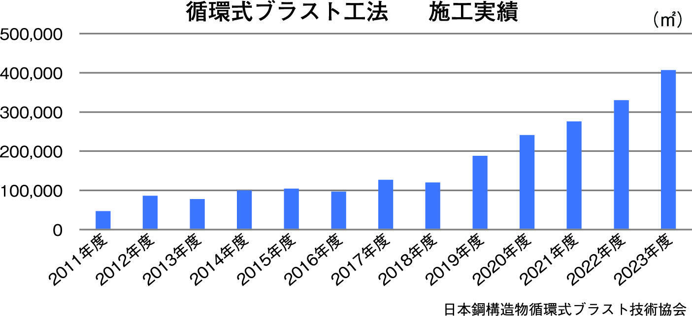 近年はPCBや鉛を含有する旧塗膜の除去工事需要が旺盛となっており、循環式ブラスト工法の採用が全国各地で増えている。令和5年度のJSCB会員の施工実績は、北海道から九州、沖縄など28都道府県で40万7,000㎡となった。前年度比では23%増であり、毎年2割増で推移している。