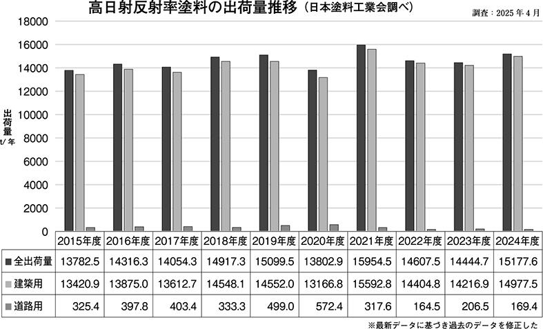 日本塗料工業会によると、2024年度の高日射反射率塗料(遮熱塗料)の全出荷量は前年比5.1%増の1万5,177トンとなった。前年を上回ったのは、1万5,954トンを記録した2021年度以来3年ぶり。コロナ禍の収束以降、建築用塗料需要が低調に推移する中、遮熱塗料の堅調ぶりが目立つ。暑さ対策に加え、塗装工事の付加価値展開が需要を押し上げたものと見られる。