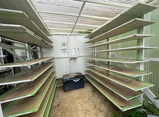 同社では、塗料廃棄作業のための簡単な小屋をつくり、その壁に専用ボードを放置しておける棚を造作(上の写真)。全部で20枚ほどのボードで廃棄塗料を乾かすことができる。作業らしい作業と言えば、乾燥用のボードに塗料を流し入れるときだけだが、それとて「ものの数分で終わる作業なので、廃棄する塗料を職人に指示しておくと現場に行く前に終わらせてくれている」と、負荷もかからない作業だ。