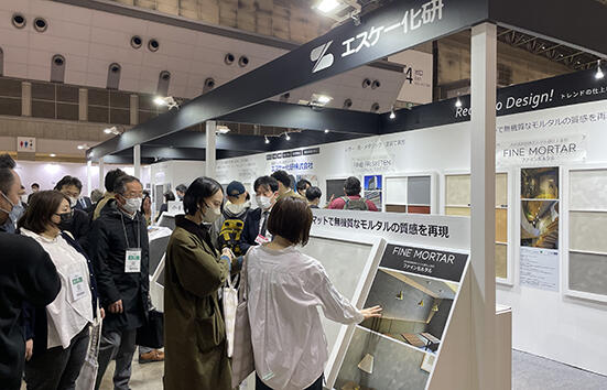 中でも目を引いたのは、モルタル調仕上塗材の「FINE MORTAR(ファインモルタル)」だ。マットで無機質なモルタルの質感は、商空間をスタイリッシュに演出するとして人気のトレンドで、「ポイントは、モルタル調の高度な意匠を再現する施工体制を広範囲な地域で整えていることと価格対応力」とアピール。設計やデザイナーがスペックしやすく、かつ現場の手離れの良さを強みとし店舗設計の市場で存在感を高めている。同品は内外装用の特殊仕上塗材で、モルタル調、テラコッタ調など12色のバリエーションを揃える。