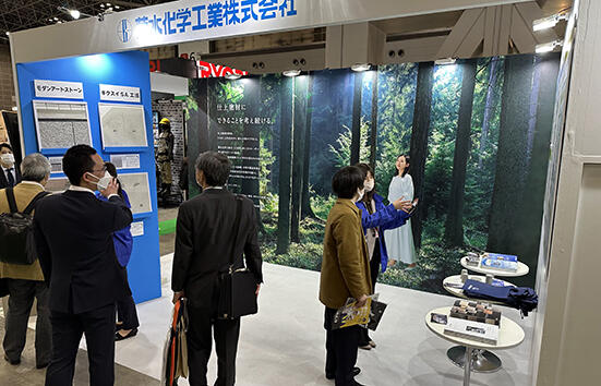建築・建材展に出展した菊水化学工業。建築仕上材の領域では、打ち放しコンクリートの再生工法「キクスイSA工法」や、内外装仕上用シート装飾材「モダンアートストーン」など独自性の強い製品群を展示。このうち、「モダンアートストーン」は、磁器タイルの建物の改修において、石材調の豪華な外観へのグレードアップと、シートの鎧張り工法によるタイルの剥落防止を同時に実現するとして脚光を浴び、再び販売を伸ばしている。