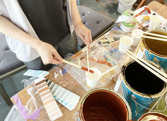 今は、調色作業の他にカラーシミュレーションや、地域の人たちに向けたペイントワークショップの運営も担当している。就職先が塗装会社に決まったと両親に報告したとき、「見ず知らずの世界なのに大丈夫?」と少し心配されたけれど、調色という特殊なスキルを発揮でき、皆から頼りにされているこの仕事に「とてもやりがいを感じています」と微笑む。
