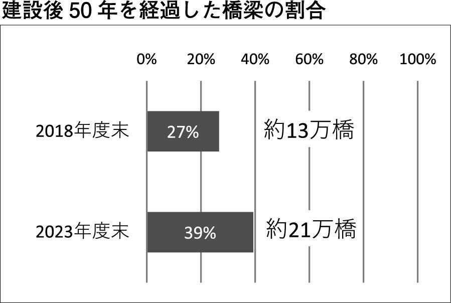建設後50年を経過した橋梁の割合は、2032年度には約6割に達することが分かっており、老朽化対策は喫緊の課題とされている。