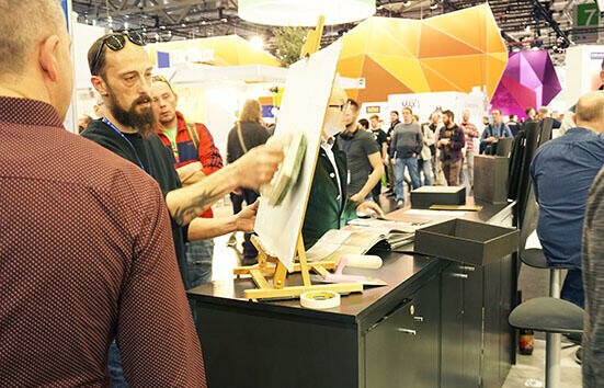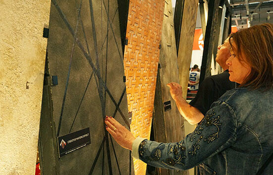 1日で回りきれないほどの広い会場を埋め尽くしていたのは、いわゆる特殊塗装のカテゴリーの材料や技法。ヨーロッパ中の塗料メーカーが集まり、自社の製品や工法を競っていた。
