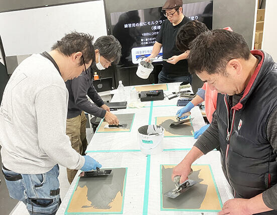 参加した人たちからは、「施工性や仕上がり感を確認できたので、進行中の店舗設計で使いたい」「扱いづらいというマイクロセメントへのイメージが変わった」「壁の仕上げ、家具や什器などいろんなところに使え、提案の幅が広がる」など好評で、プロ好みのマイクロセメントとして広がりそうだ。