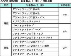 「GOOD JOB保証サービス」の対象は戸建て住宅やアパート、小規模マンションなどの塗り替え工事で、その外壁と屋根に対して著しい塗膜剥離が起きた場合に施工店と連名で保証する。対象塗料は、同社の「パーフェクトシリーズ」「グランセラシリーズ」「アプラウドシェラスターⅡ」で、保証年数は使用する塗料により外壁5~7年、屋根は3年(使用塗料によらず同一)。