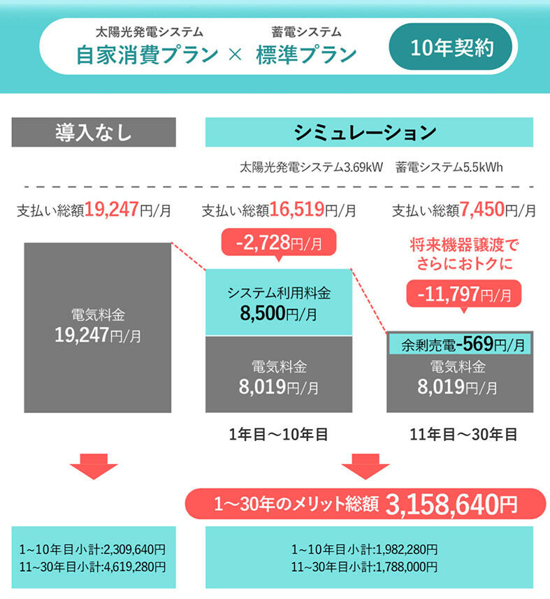 具体的には、パネル代、設置費用などの初期コストを実質ゼロにするサブスクリプションサービスを提供。購入者とっては、10年、15年と契約期間に応じた月額料金が発生するが、太陽光パネルで生み出した電気を自家消費に回すことで本来かかるはずの電気料をほぼ相殺することができる。更に契約期間終了後は、そのまま利用者に無償譲渡されるため、施主は電力費の支出を抑えたまま、必要電力を確保することができる。
