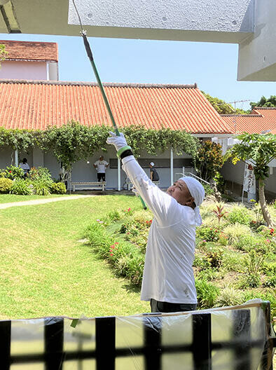 工程の中で最も手こずったのは、下地の洗浄だ。「高温多湿な地域だけに、とにかくカビがすごかった。しかも、本土なら高圧洗浄で落ちるようなカビも、沖縄のものは頑固で強力。結局、マジックロンやデッキブラシを使って人力で擦り落としました」(澤田さん)と手を焼いた。