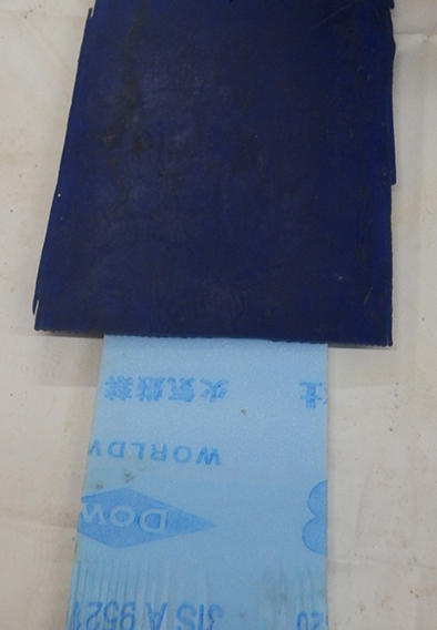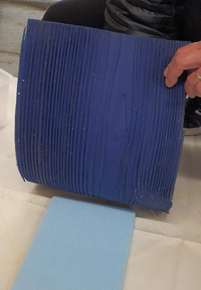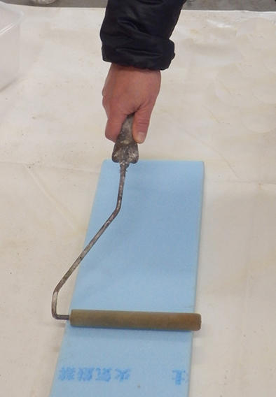 厚さ20mmのスタイロフォームの表面に①同社レシピによる特殊液剤をローラーで塗布②液剤を塗布した面を特殊モルタル用のシリコンゴム製のスタンプで型押し(各種の柄、模様)③スタンプをめくる―の3工程だけ。時間にしてわずか数分の作業だ。