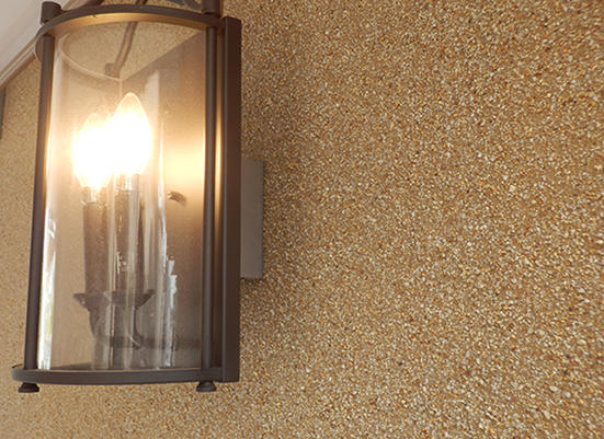 本窯業化工は、水性樹脂塗材をベース吹きし、ベースが乾燥する前に天然骨材を吹き付けて石洗い出しのテクスチャーを表現する仕様で提案。当初はスムーズに進むと見ていたが、骨材の調達に思わぬ時間を要した。「オリジナルの石洗い出しには黄味や肌色の美しい天然骨材が使われていましたが、現在、国内では入手困難なことが分かりました。次に、意匠的に近似の天然骨材を国内で探し出しましたが、今度は粒径の問題が浮上。このため骨材を再粉砕して粒径を細かくし、なんとかオリジナルのテクスチャーに近づけることができました」(山本窯業化工担当者)と経緯を説明。