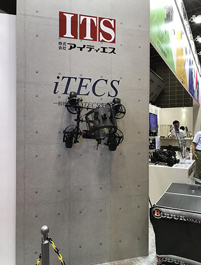 ドローンを利用した点検用ロボットの開発を行うボーダック(埼玉県吉川市、社長・太田宝得氏)と、コンクリートの非破壊診断装置機器の販売を行う日東建設(本社・北海道紋別郡、社長・久保元氏)が共同で開発を進めているビル外壁診断装置「IDA-03」は、プロペラの推進力と走行輪で垂直な壁面を移動しながら打診検査を行う。マンションやビルのタイル外壁の浮き・剥離の診断や、橋脚・トンネルなどインフラ構造物の打診検査が主な目的。