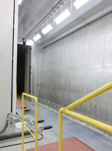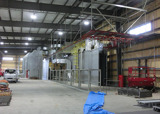 新工場は93m×19mの大規模なスペースを確保。前処理設備と自動コンベア搬送の塗装ラインがあり、塗装ラインは縦吊り3,500mmまでのサイズが可能になっている。