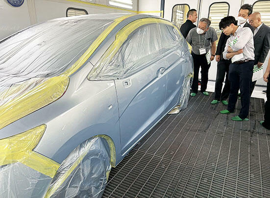 その後、研修センターに場所を移し、新製品の「PPエコブレンダー」「レンズリフォーマー3」「ハイアートCBエコ 水性防錆コート」「ノンスチレンスプレーパテ」(開発品)、「ビーストブースト剤」の自補修用5製品と工業用水性2液ウレタン塗料「ポセイドン5000」を紹介。加えて昨年発売した「CRONOS HD」、環境対応型耐スリ傷性向上クリヤー「アクセルスピカクリヤーTエコplus」(トヨタセルフリストアリングコート対応)の実演塗装を行った。