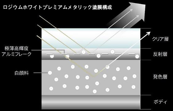 反射層には、極薄の高輝度アルミフレークを含んだ塗料を均一に塗装し、乾燥過程で体積を大幅に収縮させる手法を採用。一般的な反射層の約15分の1である約0.5ミクロンまで極薄化した塗膜の中に、アルミフレークが一定間隔で平滑に並んだ状態を形成し、光の当たる面全体が強く輝くリアルな金属質感を表現した。アルミフレーク1つ1つを均一に分散しつつ、アルミフレークの角度をボディ曲面に並行に沿わせることで、明度の高い白であっても艶やかさと光が当たった時の陰影感を演出する。