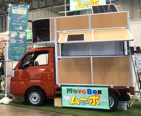 ムーボはキットを組み立て軽トラックに取り付けるだけでキャンピングカーになる優れもの。フレームやパネルを固定し断熱材を挟んでいくだけで1人でも簡単に作れるのが特長。窓や扉の位置も自由に変えられ、オプションでベッドやテーブルの他、シンクなども用意されており、キッチンカーとしても拡充できる。