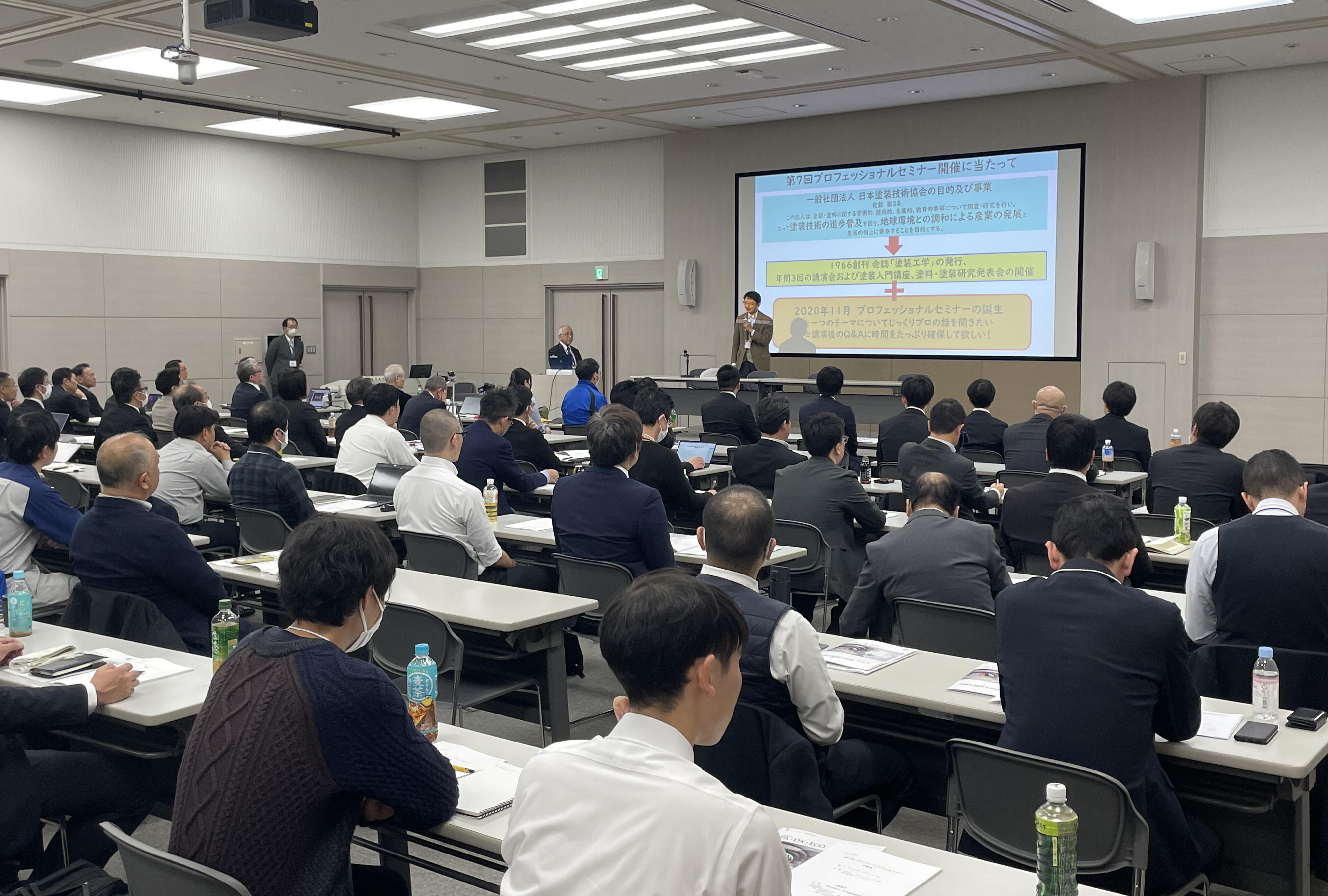 日本塗装技術協会(会長・工藤一秋氏)は、昨年12月21日、日本ペイントホールディングス東京事業所センタービルで「第7回プロフェッショナルセミナー」を開催した。同セミナーは、講演企業を1社に絞り、質疑応答を含め参加者との意見交換を目的にした技術交流セミナー。2020年の開始以来、初めて会場開催となった今回は、タクボエンジニアリングの佐々木栄治社長、小島光氏、上村一之氏の3名が登壇し、塗装技術の未来像や開発中の塗装システムの進捗状況について語った。当日は、塗料、塗装設備、自動車関連など約90名が参加。実行委員長の奴間伸茂氏が司会を務めた。