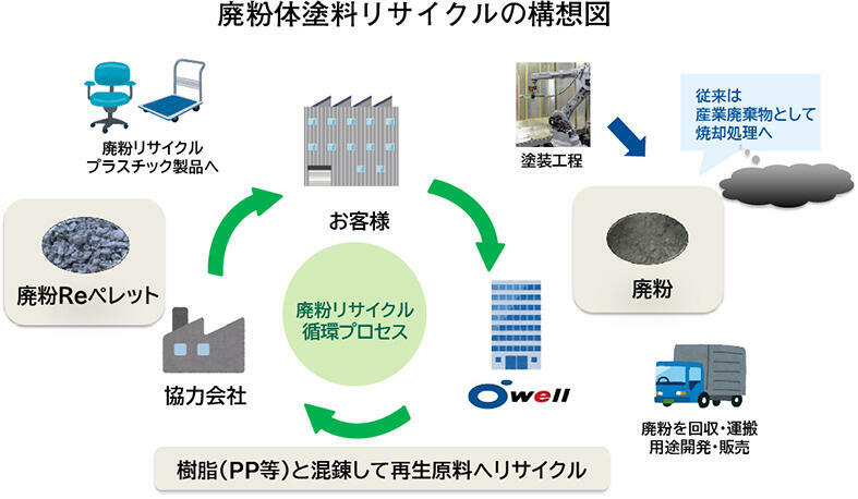 「廃粉体塗料リサイクル事業」は、粉体塗料を使用する顧客からオーウエルが廃粉体塗料を購入し、協力会社でペレット加工した後に、その「廃粉Reペレット」をその顧客に樹脂成型の原材料として販売する。つまり、同社が廃粉体塗料を回収・運搬し、用途開発及び販売を行うことで循環させる仕組み(サーキュラーエコノミー)。