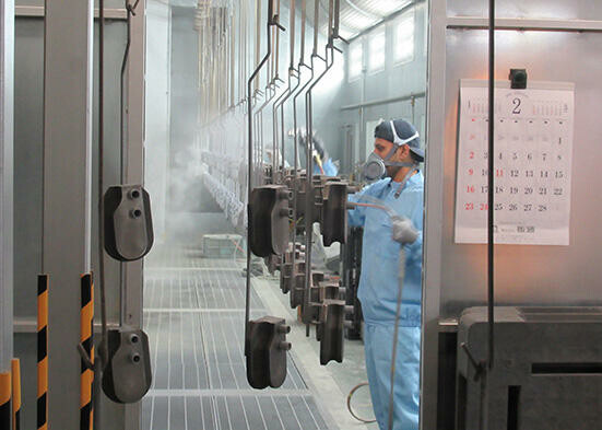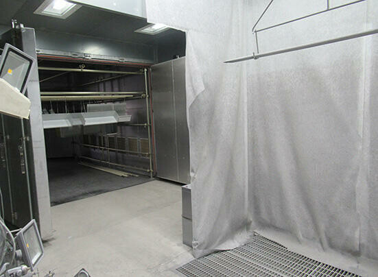 塗装設備は大物に対応した単独ブースと塗装ラインの2つを揃える。単独の塗装ブースは2mまでの大物ワークサイズにも対応している。重量物もあるため天井からホイスト式クレーンを設置、塗装後は隣接する乾燥炉にワークを移動させて焼付乾燥工程に入る。クローズドされた塗装ブース内の空調は上から下へ流れており塗料飛散を抑えた空調設計としている。