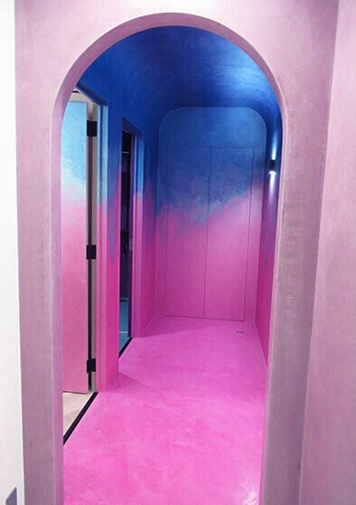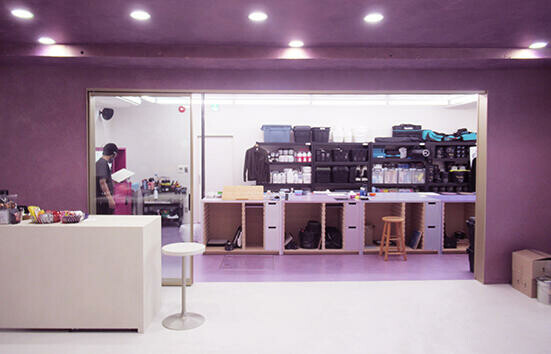 床や天井にもパールなどの光輝材を含有した塗装仕上げ。壁や天井をはじめとしてカラーデザインはHUSのイメージカラーであるパープルを基調とし、床はショールームスペースがホワイト、隣のワークスペースはパープルで区分けされている。