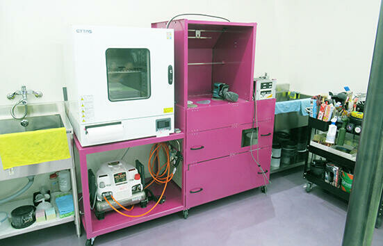 隣のワークスペースではテクスチャーペイントのワークショップや粉体塗装の見本板作成も行える。自製した塗装ブースと小型金庫炉を完備しており、その場で粉体塗装が行える。溶剤を使わない粉体塗装ならではの扱いやすさを生かしている。