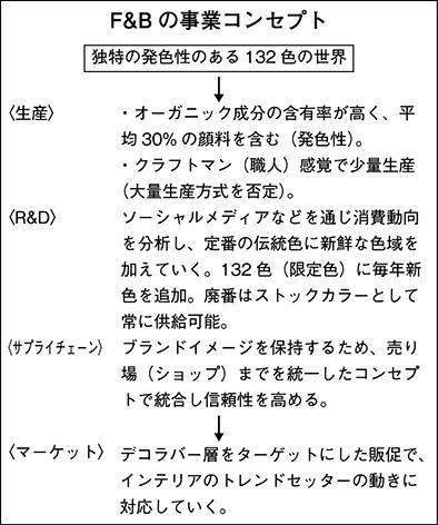 F&Bは1930年代にイギリスの田舎町であるウィンボーンで、ジョン・ファロー氏とリチャード・ボール氏によって創業されたローカル建築用塗料メーカー。90年代に入り大きく変身を果たす。色彩戦略を軸にプレミアムペイント事業にシフトしていく。当時、イギリスばかりでなく、世界各国で地球環境の危機が叫ばれ、ナショナルトラスト運動が盛り上がっていた。こうした背景の中でF&B社はイギリスの歴史的な建物に由来を持つアーカイブシリーズの色域を開発。132色のストーリーを持ったカラーパレットを創造する。例えばビクトリア朝時代のタペストリーからヒントを得たペイントカラーに物語性を付与して展開するなど、伝統色を再現した。