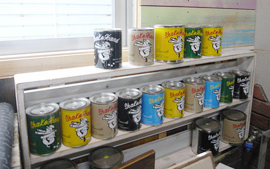 とにかくこだわった塗装仕上げに情熱を込める。ついにはオリジナルペイントを開発。取引先の塗料ディーラーに依頼し、24色のカラーパレットがある「Shake Handオリジナルペンキ」を完成。100ccの可愛らしいポット入りで、女性客に人気があるという。