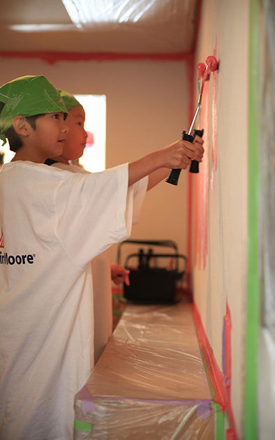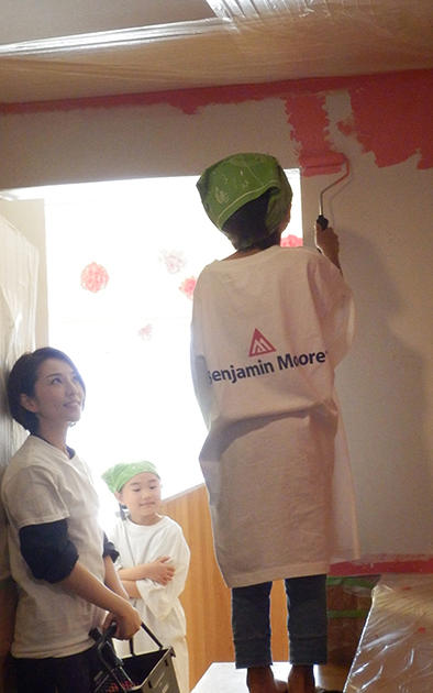 「色のワークショップ」の次は「壁塗りワークショップ」。ベンジャミンムーアペイントジャパンのスタッフたちがサポートしながら、子供たちが選んだ色を子供たちの手で壁に塗っていく。「みんな、自分たちで選んだ色という意識がありますから雑には扱いません」(園長)というように自主性や主体性を育むことにもつながる。