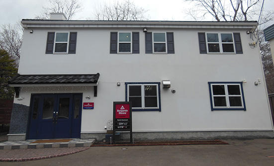 ロケーションは円山公園に隣接する高級住宅地の一角で、道路から10mほど奥まった場所。元々ベーカリーだった店舗をペイントショップにリニューアルした。木々の中に佇む北欧風の瀟洒な建物はオシャレなペンションのよう。どこか外国にでも迷い込んだような佇まいだ。ベンジャミンムーアの赤いロゴ看板がペイントショップであることを教えてくれる。