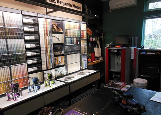 一棟丸ごとショップは余裕のある6~7台の駐車スペースを確保、来店者はマイホームに帰るような導線に導かれ店内に入ると、そこにはベンジャミンムーア独特のカラーワールドが目に飛び込んでくる。