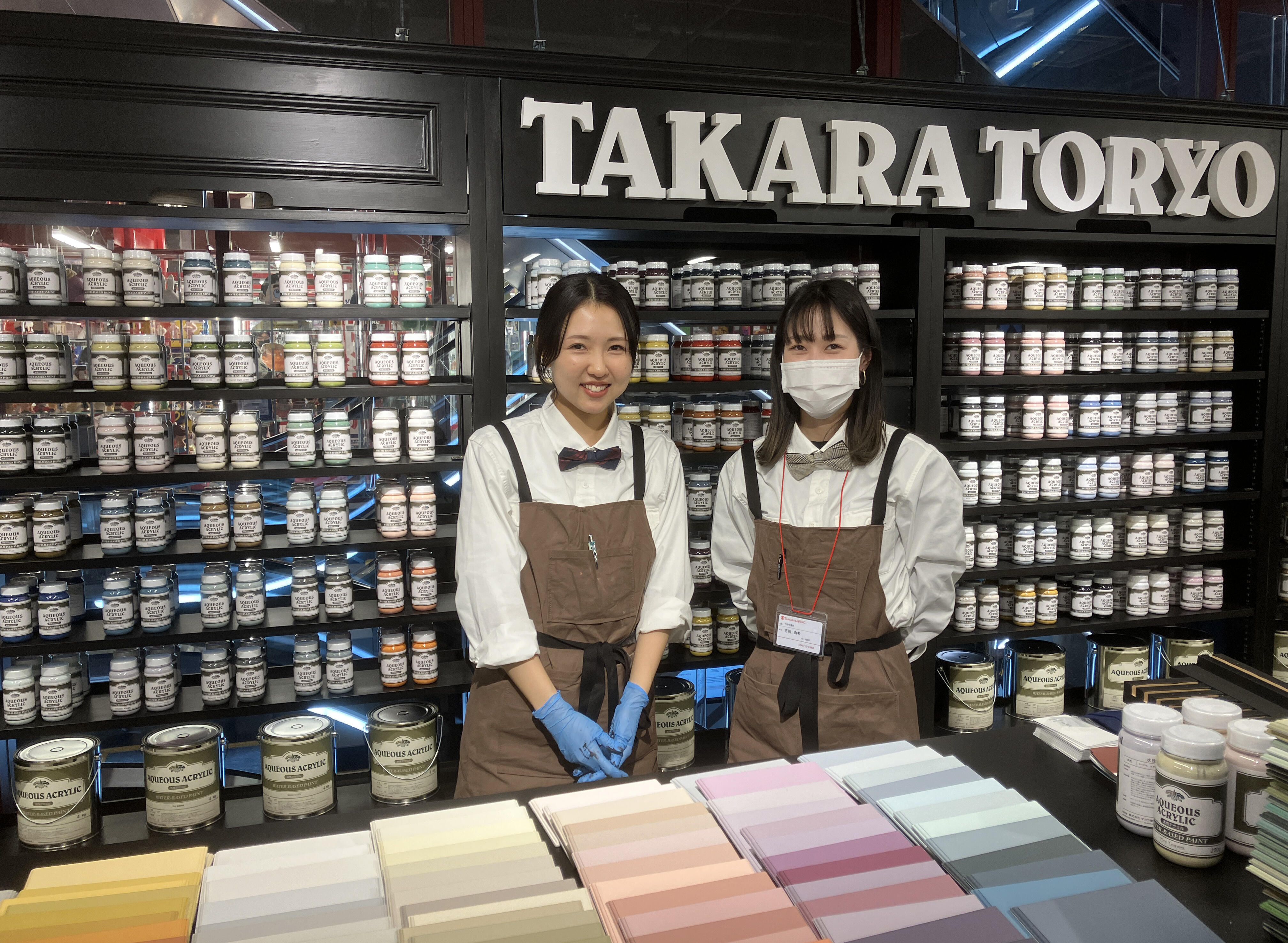 店舗の営業時間は午前10時から午後8時。タカラ塗料の女性スタッフを中心に3人体制でオペレーションし、店頭でペイントDIYの需要を喚起していく。前掛けと白のワイシャツに蝶ネクタイを締め、さながら"塗料のコンシェルジュ"のような装いで接客、ペイントショップの新たな世界観を演出している。