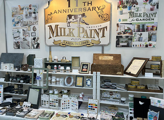 ターナー色彩は、室内壁用やガーデン用とラインアップを広げる「ミルクペイント」を出展。合わせてミリタリーテイストを引き出す「ミリタリーペイントアーミー」や「IRON PAINT」を塗った小物品も陳列し、塗装意匠の風合いやアレンジする楽しさを訴求した。