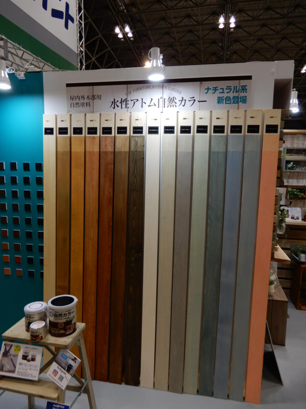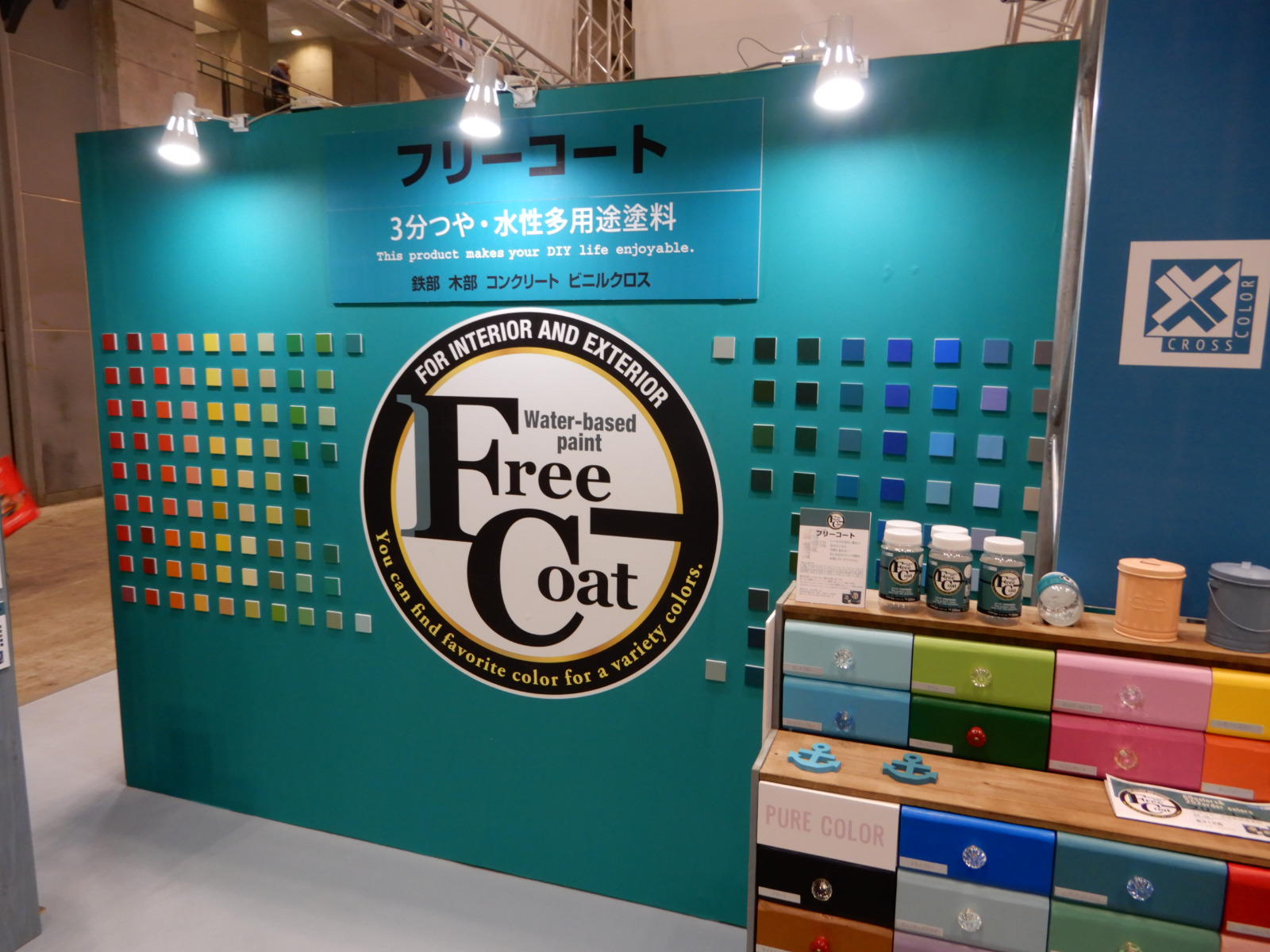 来年1月から発売する3分つや・水性多用途塗料「FreeCoat(フリーコート)」を全面に押し出した展示を行った。