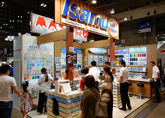 イサム塗料は昨年に続き、2回目の出展。建築用塗料市場で展開するハイブリッド型光触媒内装用塗料「エアフレッシュ」やタイル床面滑り止め塗料「スキッドガード」を紹介。歩行頻度の多い駅などに向け、防滑性向上仕様を披露した。