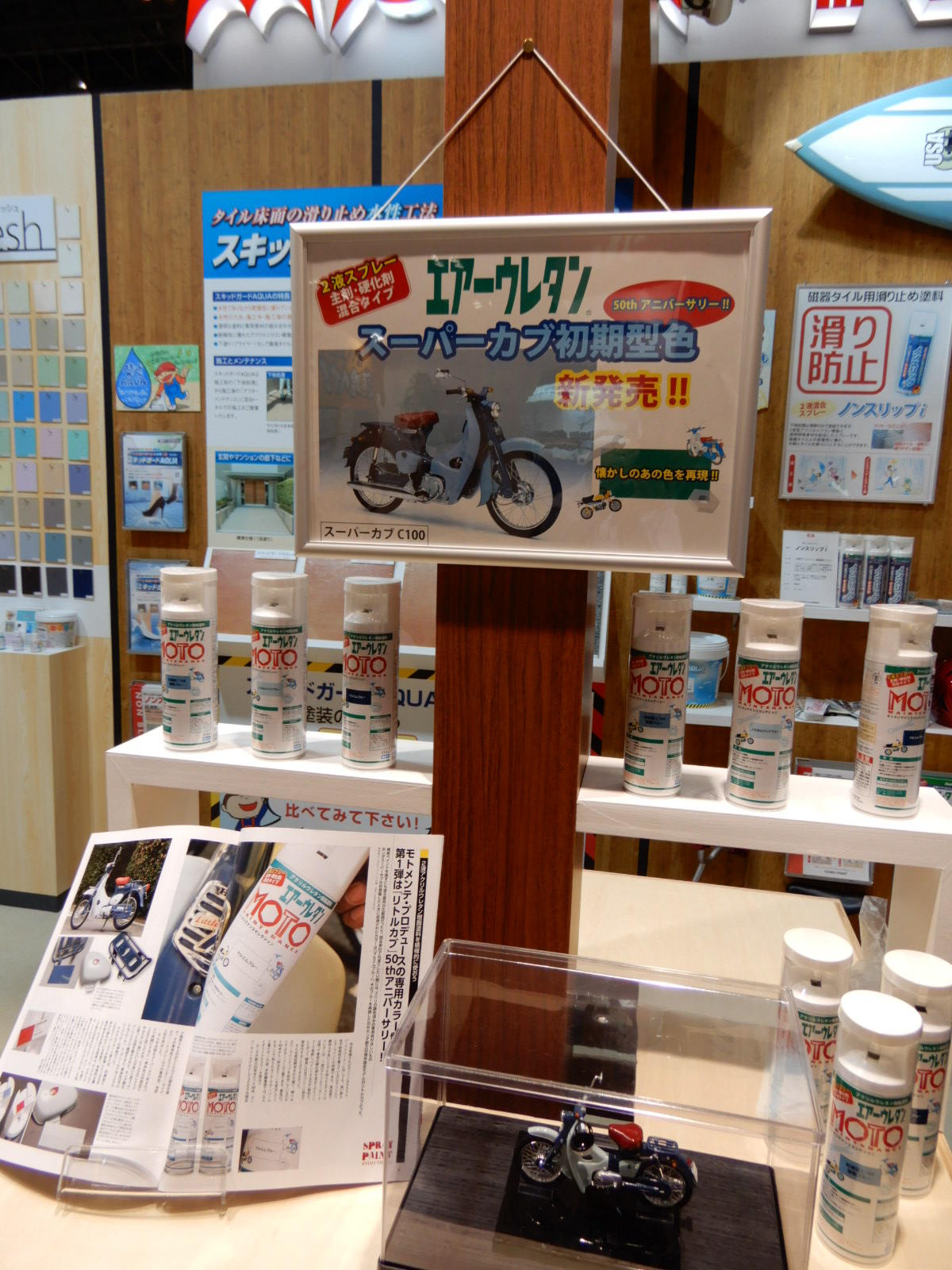 中でも2液混合ウレタンスプレー「エアーウレタン」は、発売50周年を記念して「スーパーカブ初期型色」を再現。懐かしみのあるカラーで来場者の関心を引きつけた。