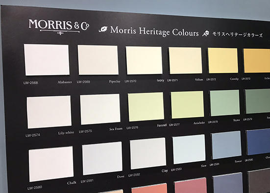 壁紙大手・リリカラーのブースで目を引いたのが"ペイント風"のビニール壁紙「Morris Heritage Colours」。イギリスの著名なデザイナー・ウィリアムモリスが使っていた伝統的なペイントカラーをビニールクロスで表現したもので、色調やマットな感じなど塗装壁のテイストを忠実に再現。「近年、店舗のインテリアではペイント壁が好まれる傾向にあり、ビニールクロスで再現しラインアップしたもの」(担当者)と説明。店舗内装のペイント支持がいずれ住宅内装に派生しそうな予感。